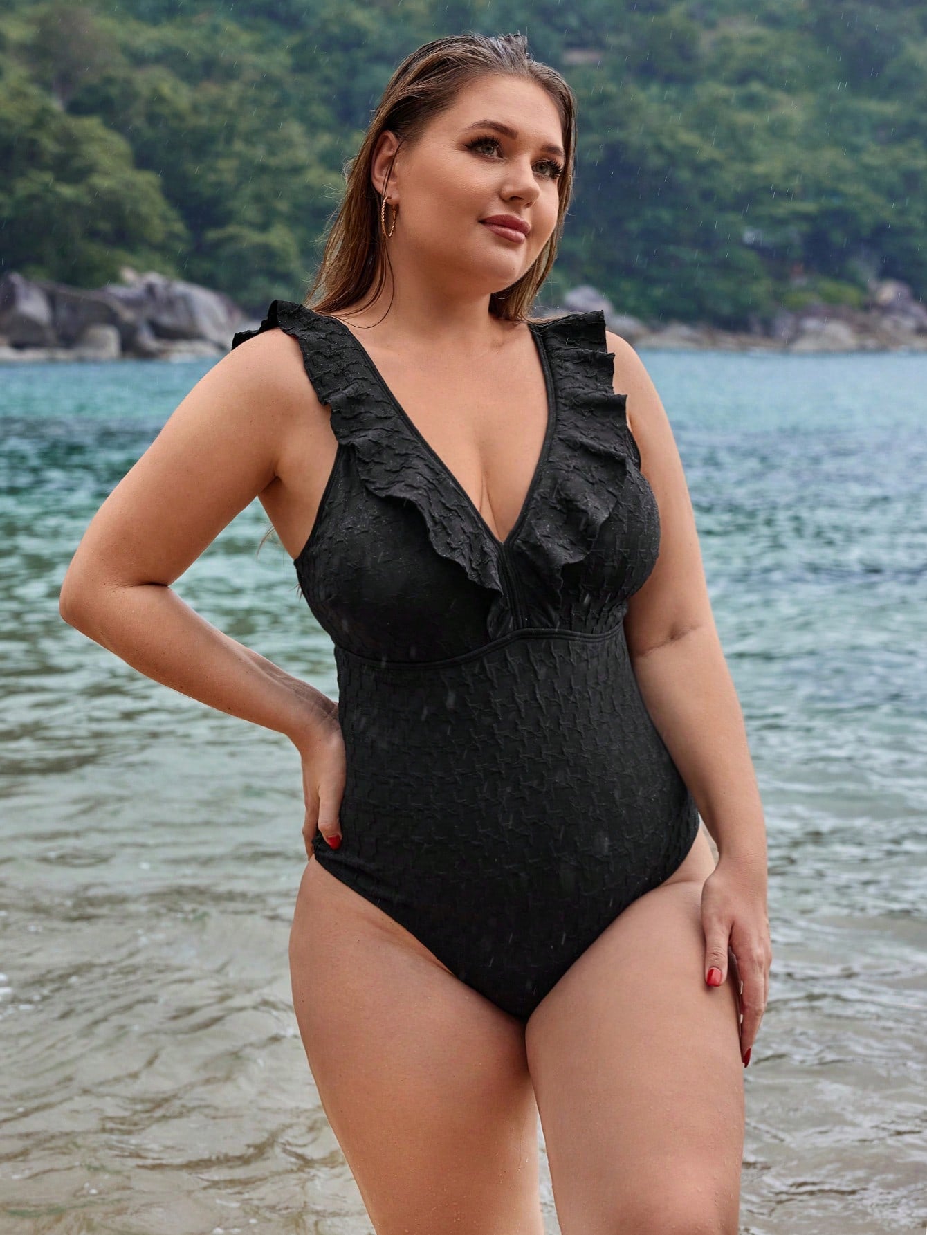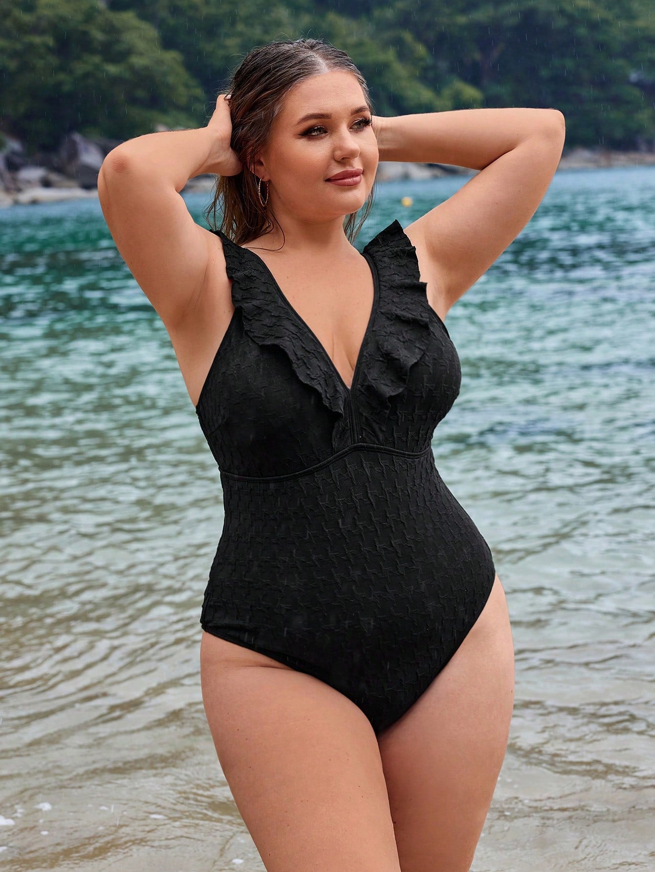 Black V Neck Ruched Ruffle Trim One-Piece Swimsuit