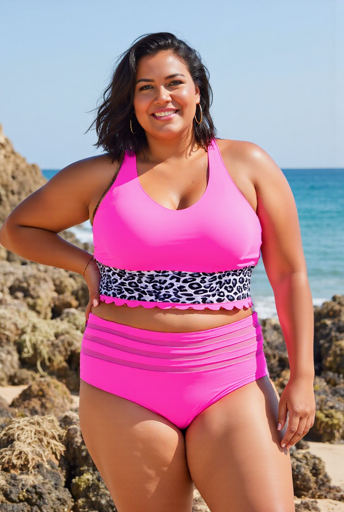High-Waist Square Neck Sexy Pink Scalloped Crop Bikini Set