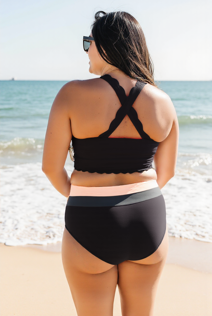 The scalloped detail will have you loving this sporty but feminine design. This crop was our Best-selling Sets of 2024! It is a bit longer than our other crops and when paired with our high-rise bottoms it gives you the illusion of a one-piece look with the convenience and comfort of a two-piece!