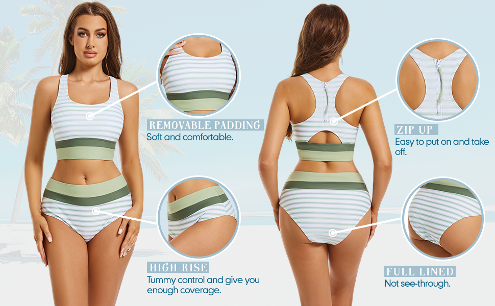High Waist Square Neck Green Striped Bikini Set