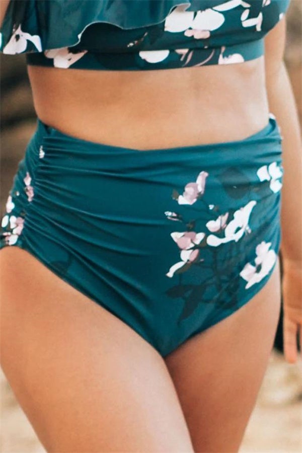 A muted teal and white flowers with pink and purple accents featuring a ruffle make this one shoulder swim top feminine and timeless. A built in shelf bra keeps everything in place while also making it nursing friendly!