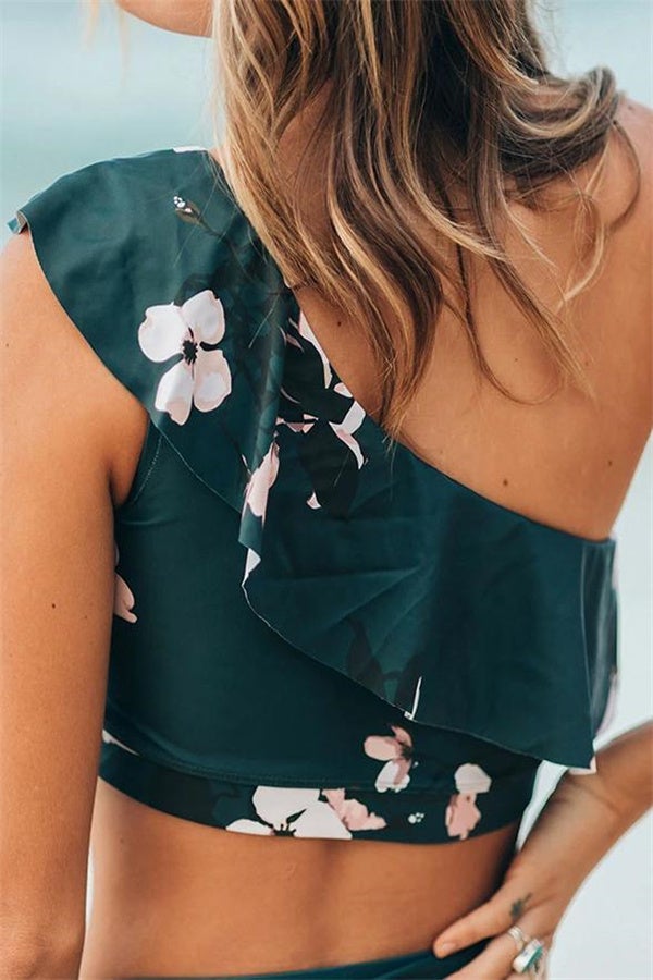 One Shoulder Green Wave Crop Orchid Bikini Set