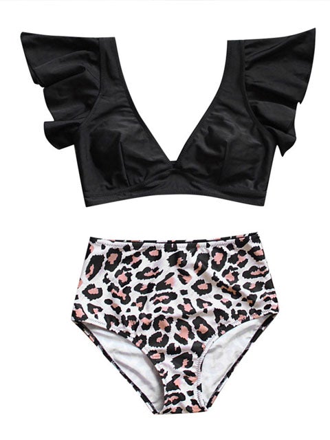 V-neck Ruffled Leopard Print High Waist Backless Bikini