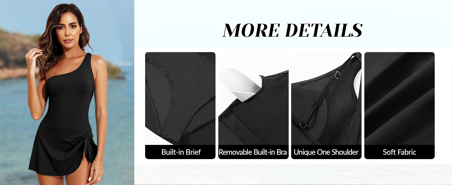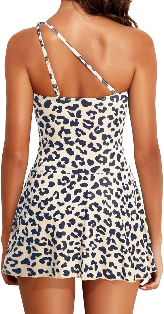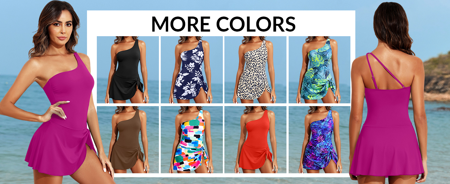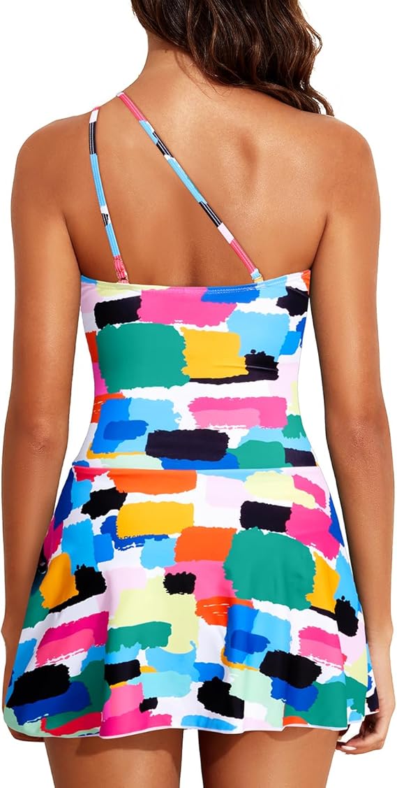 Women One Piece Swim Dress One Shoulder Swimsuit with Skirt Tummy Control Swimdress Bathing Suit